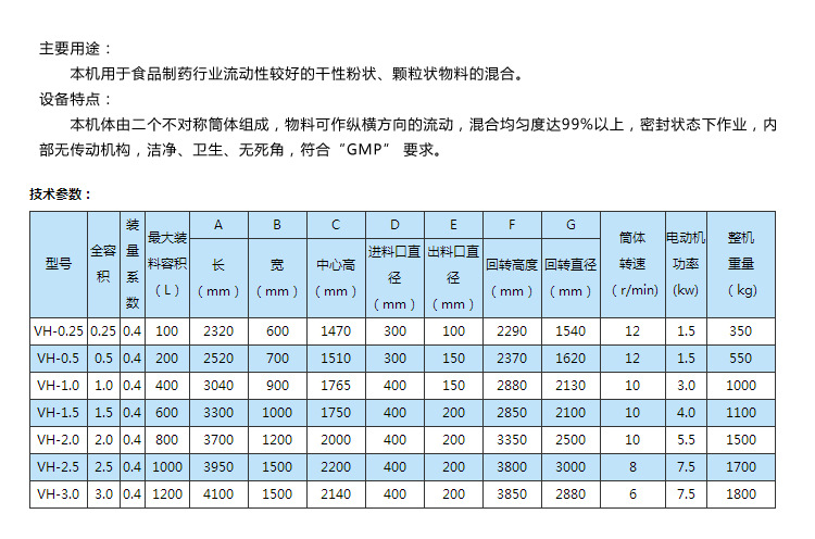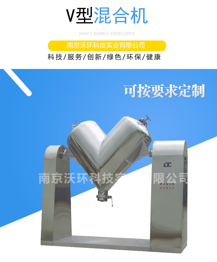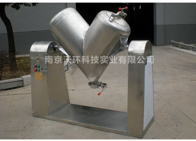 產(chǎn)品概述: 本機(jī)適用于制藥、化工、食品的干粉狀、顆粒裝物料的混合。該機(jī)混料筒結(jié)構(gòu)獨(dú)特,混合均勻,效率高,不積料。整機(jī)結(jié)構(gòu)簡單,操作容易。外表面和物料接觸部分均采用優(yōu)質(zhì)不銹鋼制造,造型美觀,維護(hù)、清洗方便。 應(yīng)用場景: 本機(jī)用于制藥及其它行業(yè)的粉狀或粒狀物料混合之用。本系列混合機(jī)有高效混合型和普通混合型兩種,高效型混合機(jī)主要對較細(xì)的粉;?qū)δ骋恢髁虾枯^少的物料均能混合均勻;普通型混合機(jī)主要適用于一般物料或產(chǎn)量較大的企業(yè)使用。筒體光滑無死角、整機(jī)采用不銹鋼材料制作、且外型美觀等特點(diǎn)。 工作原理: 本機(jī)一端裝有電機(jī)與減速機(jī),電機(jī)功率通過皮帶傳給減速機(jī),減速機(jī)再通過聯(lián)國器傳給V型桶。使V型桶連續(xù)運(yùn)轉(zhuǎn),帶動桶內(nèi)物料在桶內(nèi)上、下、左、右進(jìn)行混合。 材質(zhì)及結(jié)構(gòu): 1、 混合機(jī)的筒體采用2.5mm304-2B不銹鋼材料制作,外包采用1.2mm304-2B的不銹鋼材料制作,支架采用5#槽鋼。 2、混合的出料閥選用全不銹鋼精加工而成,并在連接處采用定型硅橡膠材料密封,確保機(jī)器在工作時的密封效果。 3、混合機(jī)的進(jìn)料口采用選進(jìn)的快開結(jié)構(gòu),使用戶在進(jìn)料和清洗時操作簡便。 4、混合機(jī)筒體兩側(cè)拼縫處加焊兩塊不銹鋼引板并采用拋光處理,使筒體內(nèi)無一處死角,確;旌蠙C(jī)在混合、清洗時能夠達(dá)到理想的效果。 5、混合機(jī)內(nèi)設(shè)有強(qiáng)制攪拌裝置。