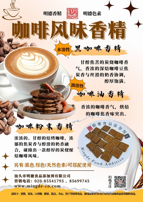 近年來,國內(nèi)咖啡消費氛圍愈來愈濃,咖啡風味多元融入了各個領域,如 果凍、餅干、雪糕等,甚至應用于室內(nèi)香氛等。順應市場潮流,提升味覺體驗。汕頭市明德食品添加劑有限公司不斷創(chuàng)新、潛心專研,當前我們擁有20余款咖啡相關風味的香精,供您選擇。并持續(xù)不斷創(chuàng)新,努力研發(fā)更多符合市場需求的風味。